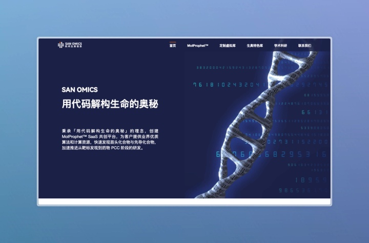 Secondly, on the Landing page, in addition to realizing the design draft, I used three.js to develop beautiful 3D DNA entrance animation effects to more vividly reflect the company's background in "high-end biotechnology". Users can also freely drag to add interactivity.